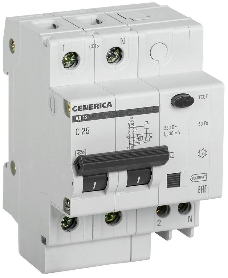 **Дифференциальный автоматический выключатель IEK GENERICA АВДТ32 2P 25A (MAD25-5-025-C-30)**
