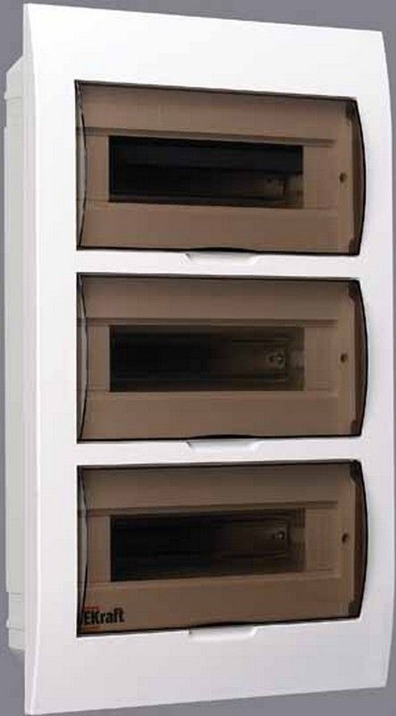 Корпус пластиковый Dekraft ЩРВ-П-36 предназначен для встраиваемой установки модульного электрооборудования. Поддерживает номинальный ток до 100 А и включает 36 модулей по 18 мм в трех рядах. Размеры: 503х341х102 мм. Изготовлен из прочного ABS-пластика, белого цвета, с дверцей из прозрачного стекла и защитой IP41. В комплекте оцинкованные DIN-рейки, шины N и PE, наклейки для маркировки и крепежные элементы. Идеален для жилых и промышленных объектов.