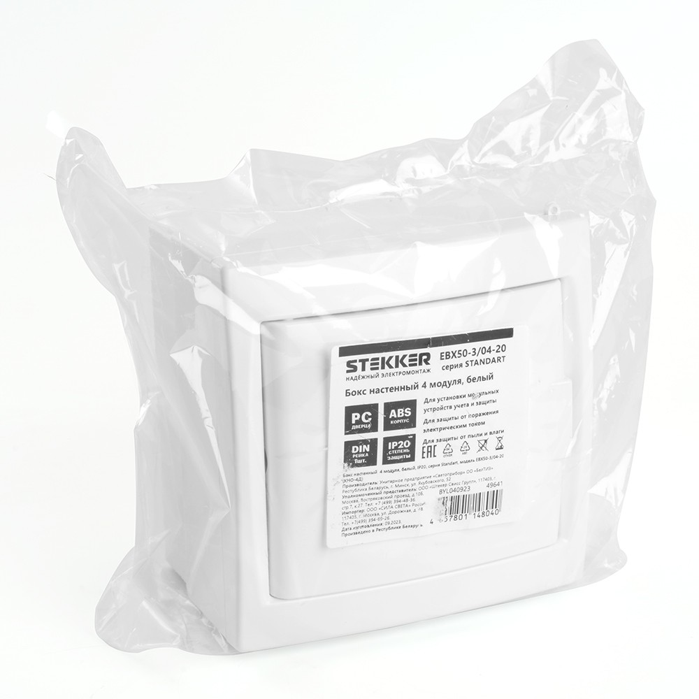 Бокс настенный STEKKER EBX50-3/04-20 4 модуля белый пластик серия Standart 49641 по цене 386 руб. с фотографией и техническими характеристиками. Для покупки товара нажмите кнопку "Купить" и перейдите в корзину или позвоните по телефону 8 (495) 585 32 60 или 8 (800) 222 23 53.