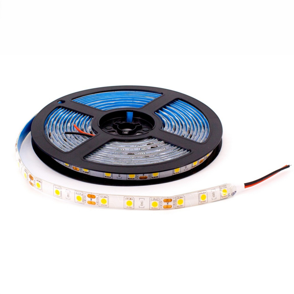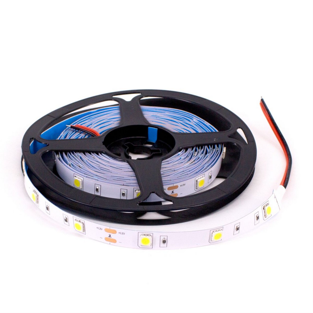 Конструкция: Лента светодиодная 5м на катушке. 30 диодов размером 5050 на метр. IP20. C липким слоем на оборотной стороне. Коннектор в комплекте.