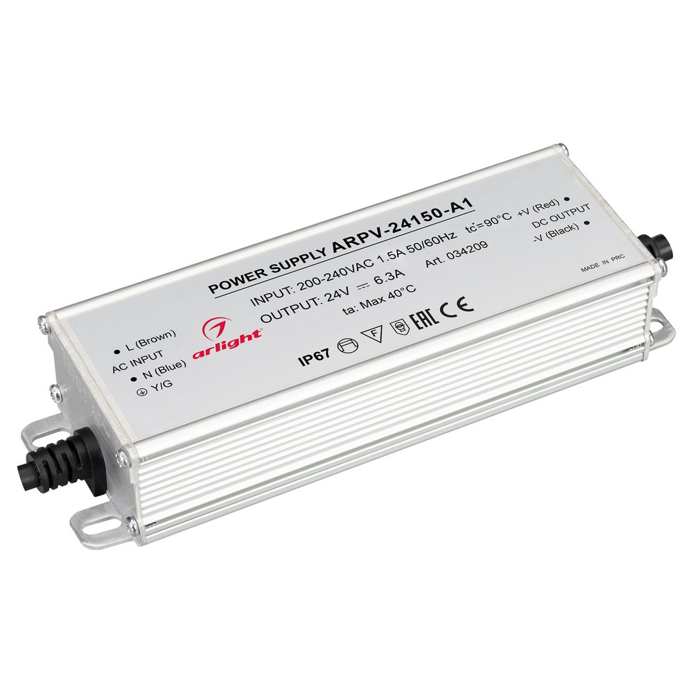 Источник напряжения с гальванической развязкой для светодиодных изделий. Входное напряжение 200-240 VAC. Выходные параметры: 24 В, 6.25 А, 150 Вт. Встроенный PFC >0.5. Герметичный алюминиевый корпус IP 67. Рабочая температура -40…+70C°. Габаритные размеры длина 174 мм, ширина 56 мм, высота 36 мм. Гарантийный срок 3 года.