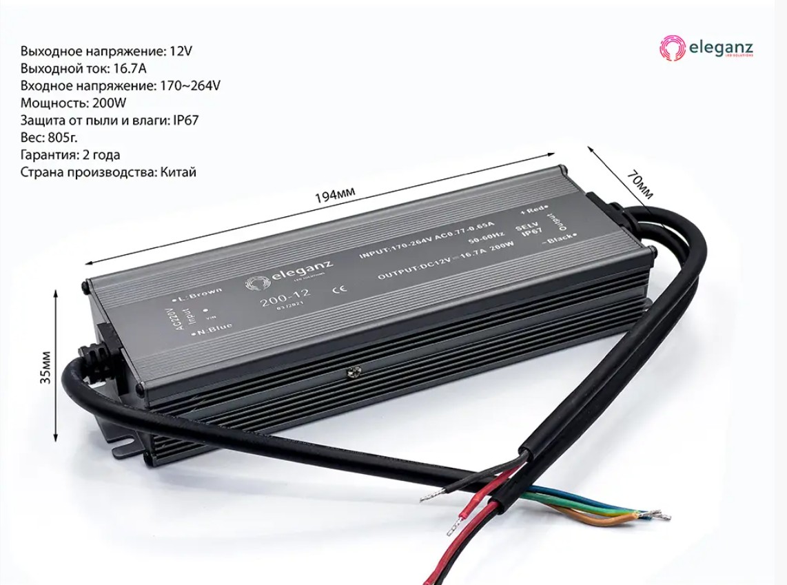 Блок питания для светодиодной ленты Eleganz 12V 200W IP67 – это надежный и эффективный источник питания, идеально подходящий для использования как в интерьере, так и на улице. Он преобразует переменный ток 220В в стабильный постоянный ток 12В, обеспечивая бесперебойную работу светодиодных лент и светильников.