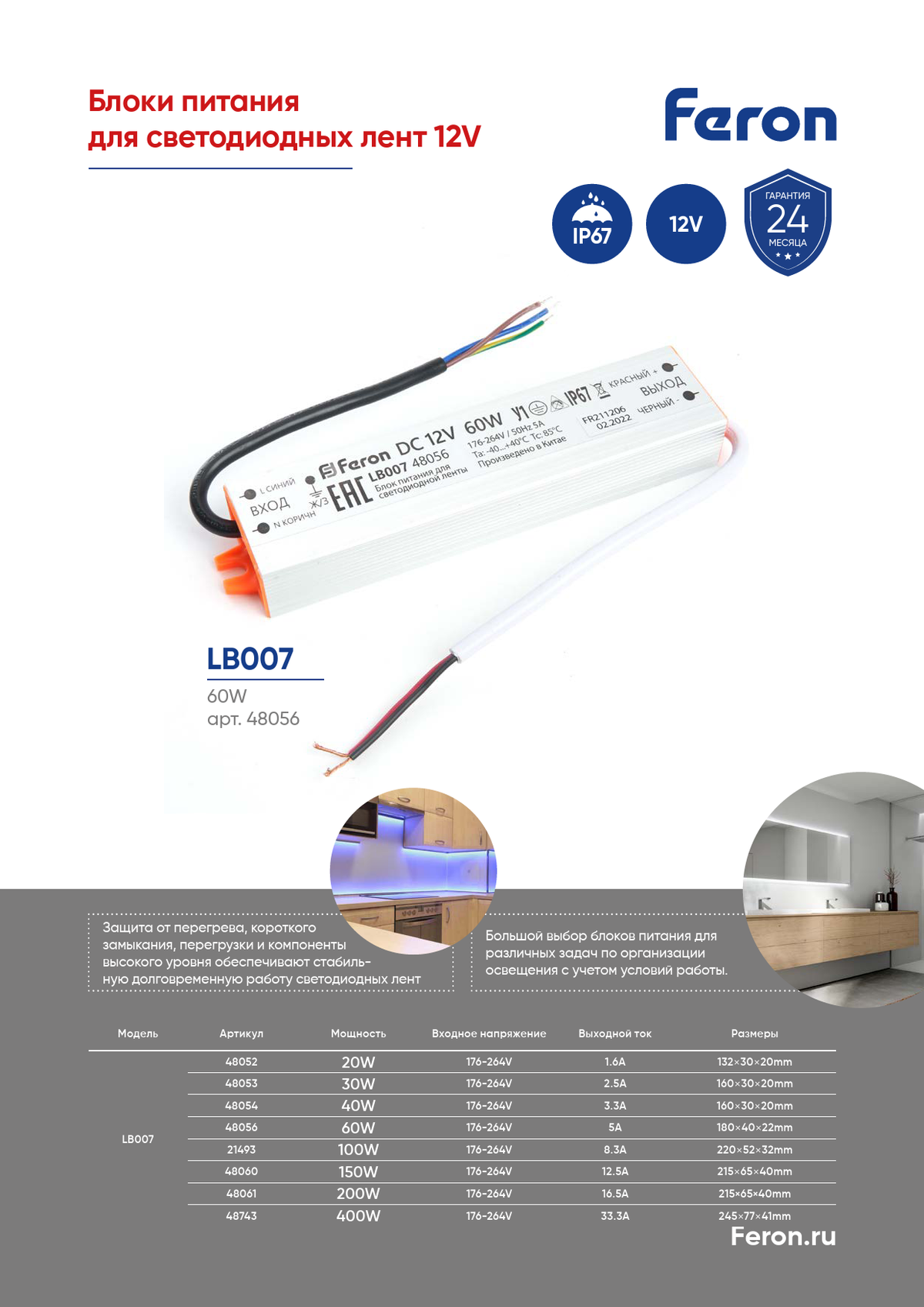 Трансформатор Feron LB007 предназначен для светодиодных лент мощностью до 150W с выходным напряжением 12V. Обладает степенью защиты IP67, что обеспечивает надежную работу в условиях повышенной влажности и пыли. Идеален для использования в наружных и внутренних освещениях.