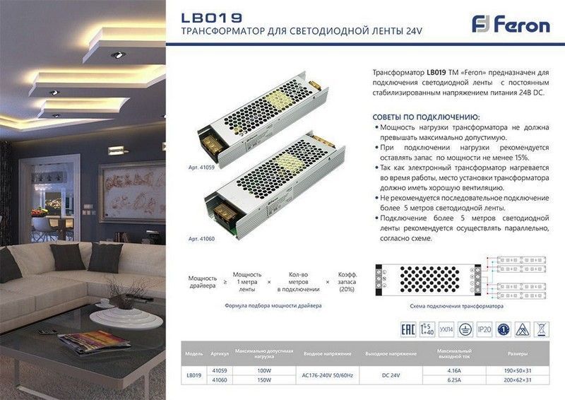 Электронный трансформатор Feron LB019 предназначен для питания светодиодных лент мощностью до 100W при напряжении 24V. Обладает степенью защиты IP20, что делает его идеальным для использования в помещениях. Надежный и эффективный драйвер обеспечит стабильную работу ваших светодиодных систем.