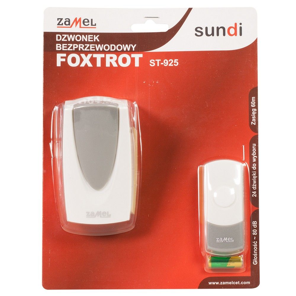 Звонок Zamel FOXTROT ST-925 беспроводной радиус действия 60м (питание от розетки 220В) по цене 2 046 руб. с фотографией и техническими характеристиками. Для покупки товара нажмите кнопку "Купить" и перейдите в корзину или позвоните по телефону 8 (495) 585 32 60 или 8 (800) 222 23 53.