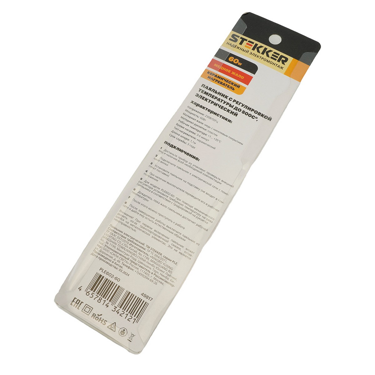 Паяльник с регулировкой температуры STEKKER PLE602-60 49817 по цене 466 руб. с фотографией и техническими характеристиками. Для покупки товара нажмите кнопку "Купить" и перейдите в корзину или позвоните по телефону 8 (495) 585 32 60 или 8 (800) 222 23 53.