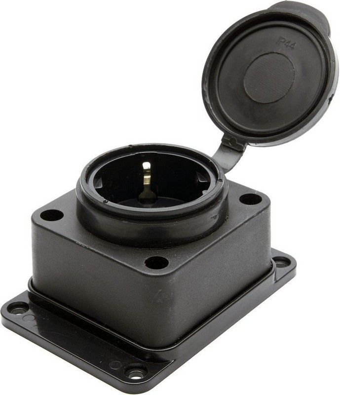 Розетка STEKKER RST16-31-44 (расстояние между монтажными отверстиями: по гориз. - 58мм, по вертик.- 85мм) на 1 гнездо, с крышкой, с заземлением. Материал: каучук, цвет черный, размер 95*66*51мм. Номинальное напряжение 250, номинальный ток 16А, диапазон рабочих температур +1..+35°C, IP44