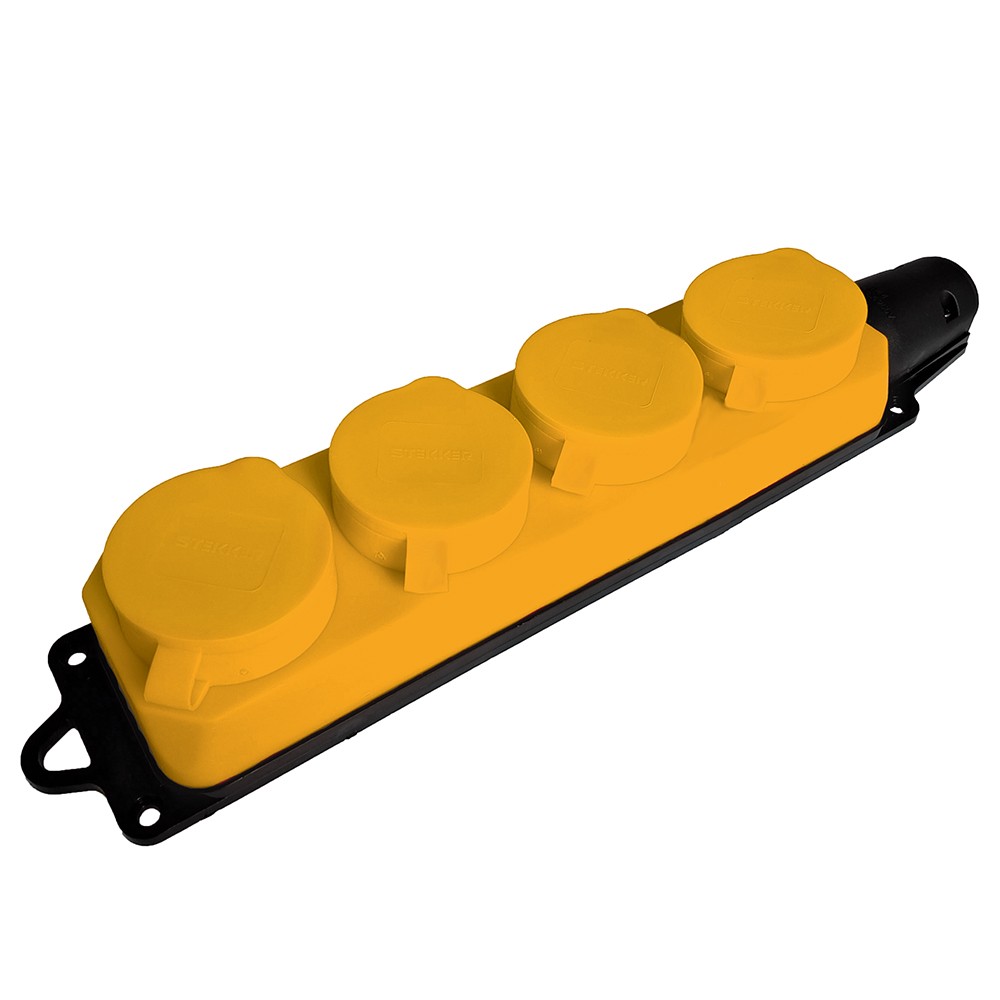 Розетка STEKKER RST16-24-44-6 на 4 гнездо, с крышкой, с заземлением. Материал: каучук, цвет желтый, размер 197*66*51мм. Номинальное напряжение 250, номинальный ток 16А, диапазон рабочих температур +1..+35°C, IP44