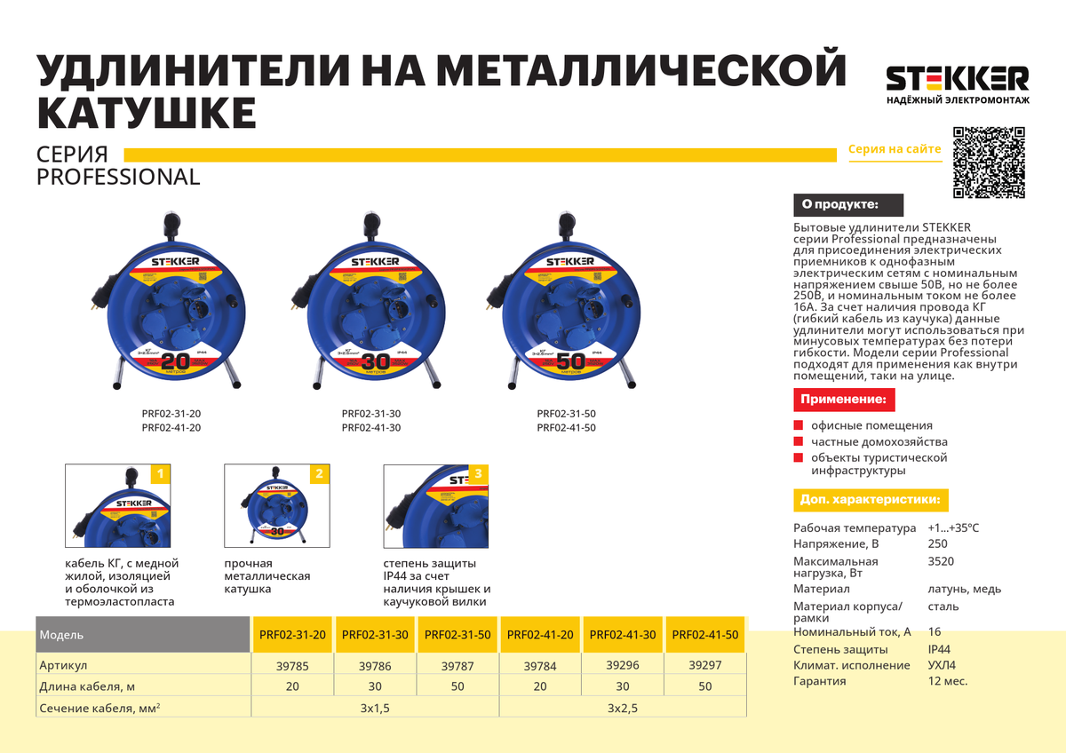 Удлинители STEKKER PRF02-31-50, серия Professional, цвет черный, длина 50 м, количество розеток 4, сталь, сечение кабеля 1.5 мм2, тип кабеля КГ, материал кабеля медь, ток 16А, напряжение 220В, максимальная нагрузка 3520Вт, тип вилки - прямая. Диапазон рабочих температур -40°C - +40°C, степень защиты IP44, класс защиты от поражения эл. током 1, размеры изделия 370*350*190. Гарантия 1 год.