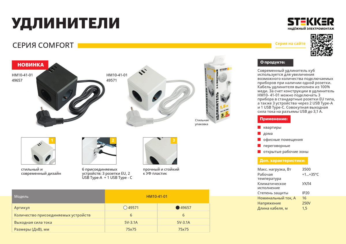 Удлинитель STEKKER 3-местный HM10-41-01 с/з 1.5м 2USB+1С 5V 3,1А Comfort черный 49657 по цене 1 056 руб. с фотографией и техническими характеристиками. Для покупки товара нажмите кнопку "Купить" и перейдите в корзину или позвоните по телефону 8 (495) 585 32 60 или 8 (800) 222 23 53.