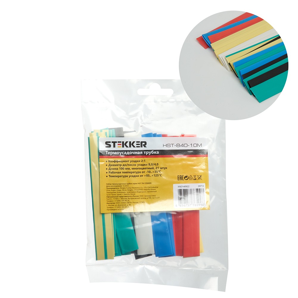 Термоусадочные трубки STEKKER HST-840-10M, длина 100мм. 21шт. в наборе, цвет: многоцветный . Коэффициент усадки 2:1, диапазон рабочих температур -10..+35°C, температура усадки +85..+125°C, номинальный ток 32А, для проводов сечением мм2.