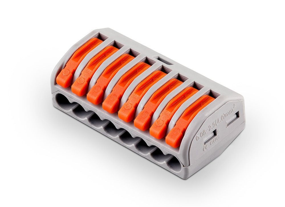 Клемма пружинная универсальная STEKKER LD222-418, 8-проводная 0,08 - 2,5/4 мм2, 400В, 24 A, 32 A, без пасты, материал изделия пластик, латунь. Тип провода одножильный/многожильный, материал провода медь, температура окружающей среды -20...+40°C