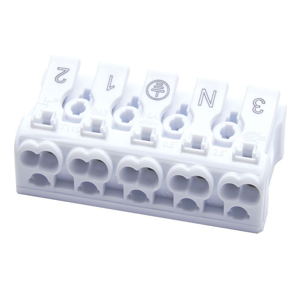 Клемма пружинная монтажная STEKKER LD294-4005, 5-проводная 0,5-2,5 мм2, 450В, 16А, без пасты, материал изделия пластик, латунь. Тип провода одножильный/многожильный, материал провода латунь/медь, температура окружающей среды -35...+85°C