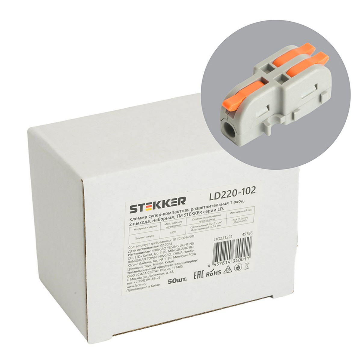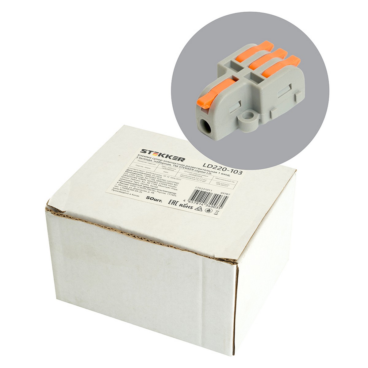 Клемма пружинная универсальная STEKKER LD222-413, 3-проводная 0,08 - 2,5/4 мм2, 400В, 24 A, 32 A, без пасты, материал изделия пластик, латунь. Тип провода одножильный/многожильный, материал провода медь, температура окружающей среды -20...+40°C