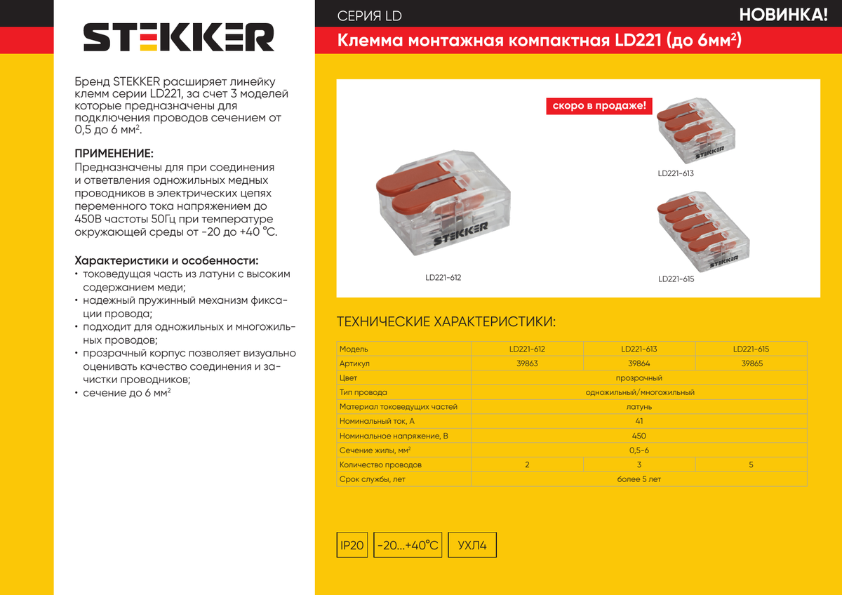 Клемма пружинная универсальная компактная STEKKER LD221-612 , 2-проводная 0,5-6 мм2, 450В, 41А, без пасты, материал изделия пластик, медь. Тип провода одножильный/многожильный, материал провода медь, температура окружающей среды -20...+40°C