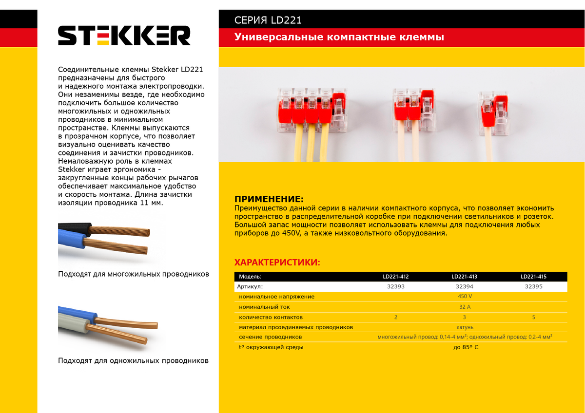 Клемма пружинная универсальная компактная STEKKER LD221-413, 3-проводная 0,14/0,2 - 4мм2, 450В, 32А, без пасты, материал изделия пластик, латунь. Тип провода одножильный/многожильный, материал провода медь, температура окружающей среды -20...+40°C