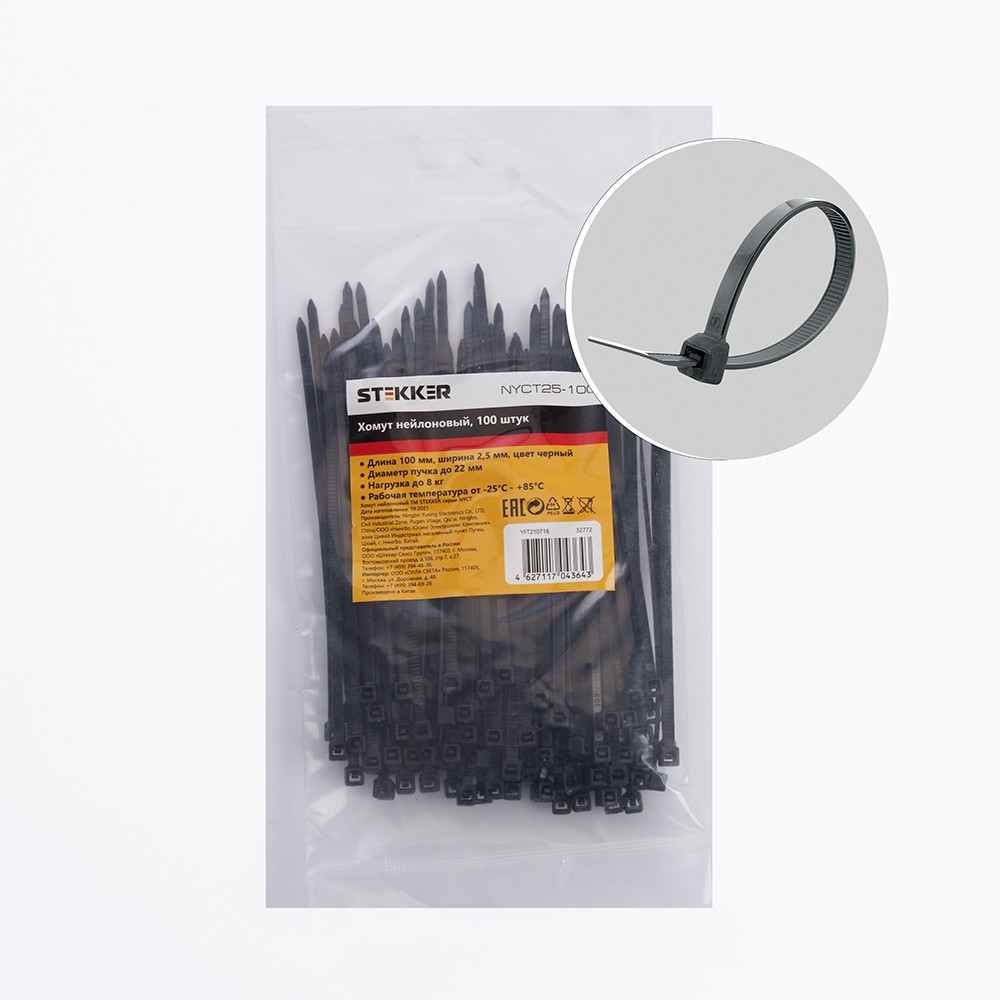 Хомут электромонтажный STEKKER NYCT25-100, одноразовый, черный, материал - нейлон , максимальный диаметр пучка - 22мм, нагрузка - 8кг, диапазон рабочих температур -25°C - +85°C, рекомендуемая температура хранениня +5°C - +25°C