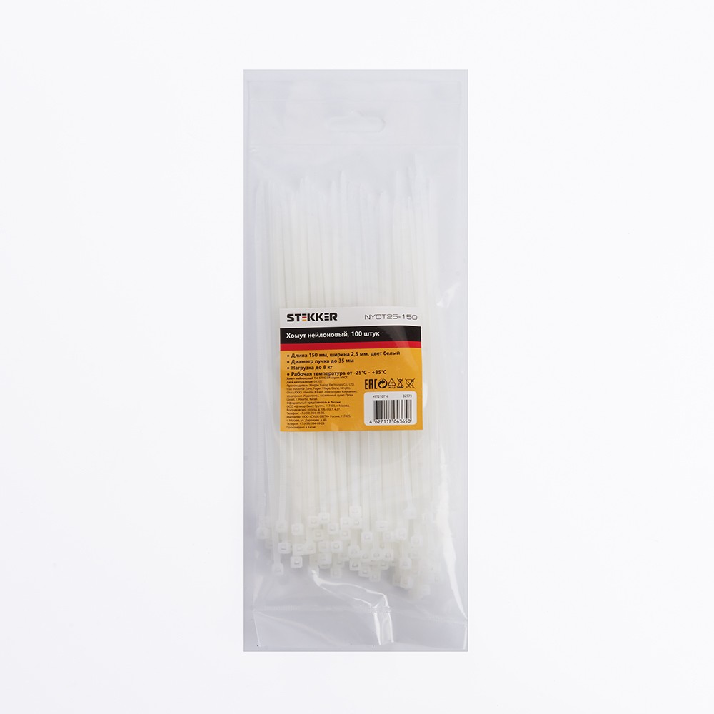 Хомут электромонтажный STEKKER NYCT25-150, одноразовый, белый, материал - нейлон , максимальный диаметр пучка - 35мм, нагрузка - 8кг, диапазон рабочих температур -25°C - +85°C, рекомендуемая температура хранениня +5°C - +25°C