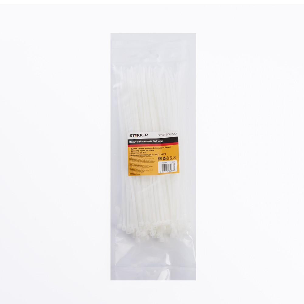 Хомут электромонтажный STEKKER NYCT25-200, одноразовый, белый, материал - нейлон , максимальный диаметр пучка - 50мм, нагрузка - 8кг, диапазон рабочих температур -25°C - +85°C, рекомендуемая температура хранениня +5°C - +25°C