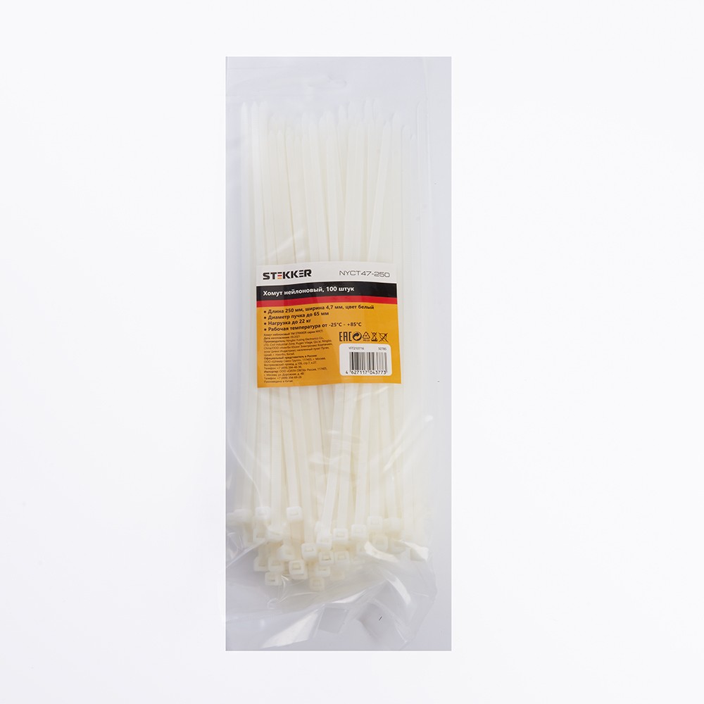 Хомут электромонтажный STEKKER NYCT47-250, одноразовый, белый, материал - нейлон , максимальный диаметр пучка - 65мм, нагрузка - 22кг, диапазон рабочих температур -25°C - +85°C, рекомендуемая температура хранениня +5°C - +25°C