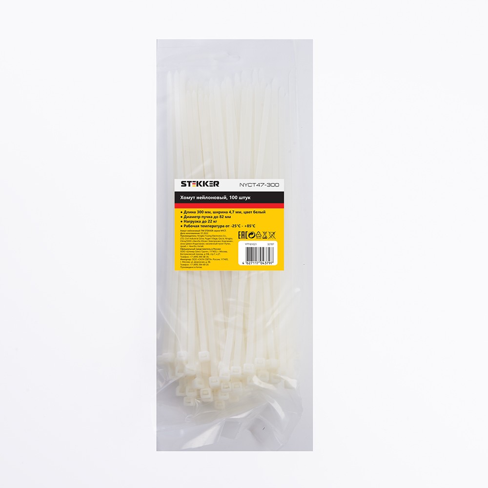 Хомут электромонтажный STEKKER NYCT47-300, одноразовый, белый, материал - нейлон , максимальный диаметр пучка - 82мм, нагрузка - 22кг, диапазон рабочих температур -25°C - +85°C, рекомендуемая температура хранениня +5°C - +25°C