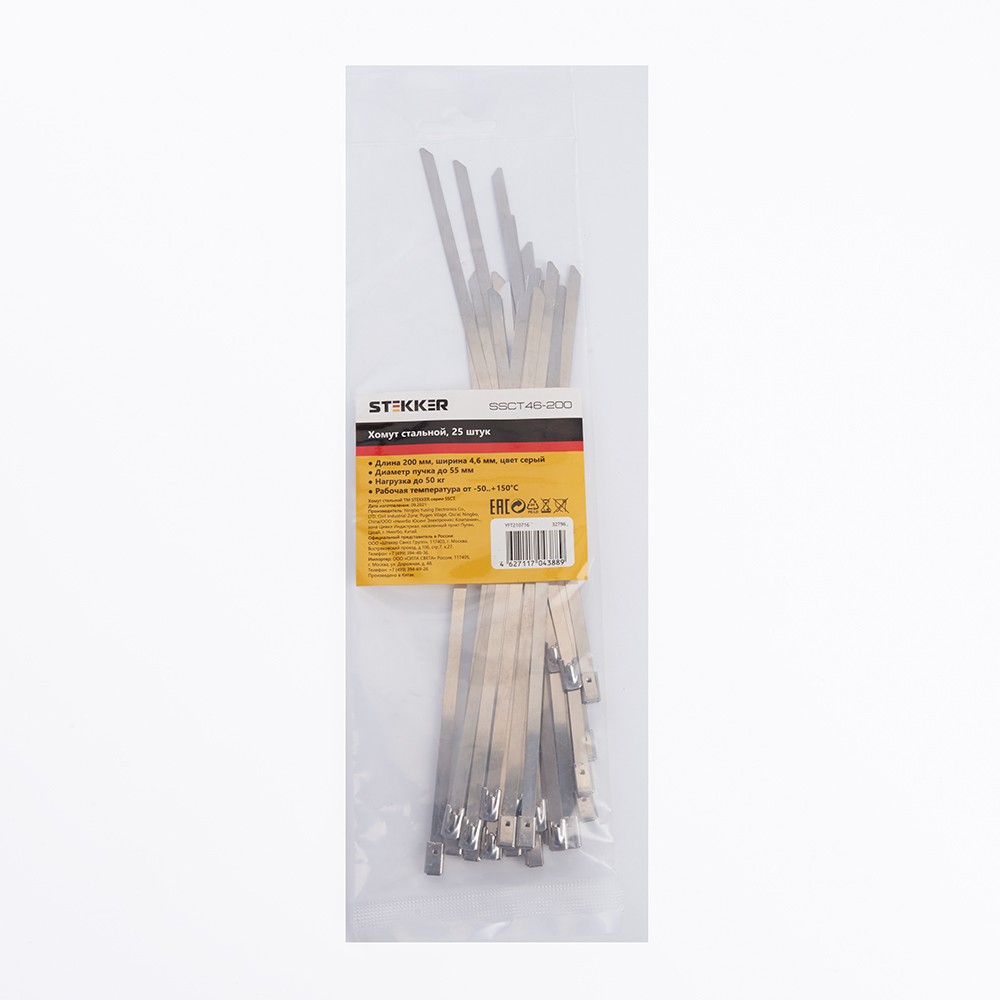 Хомут электромонтажный STEKKER SSCT46-200, одноразовый, серый, материал - сталь, максимальный диаметр пучка - 55мм, нагрузка - 50кг, диапазон рабочих температур -80..+538°C, рекомендуемая температура хранениня -