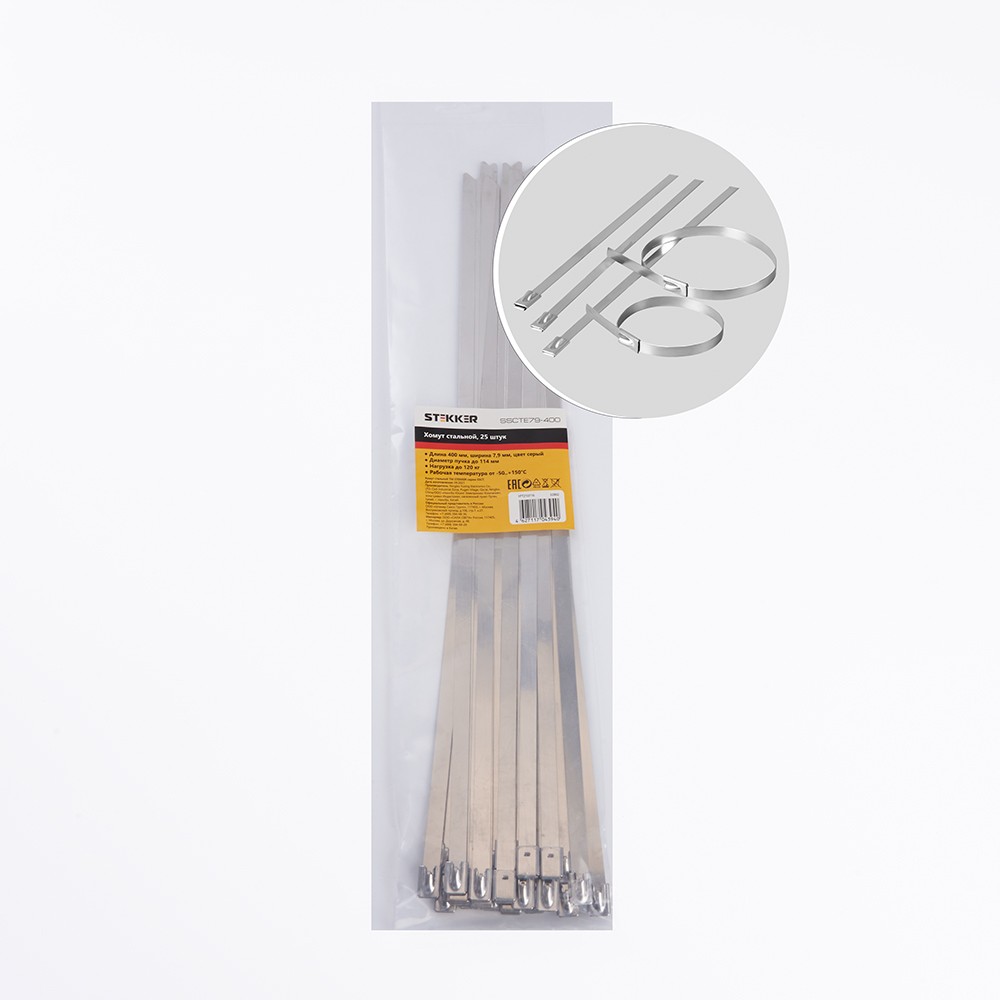 Хомут электромонтажный STEKKER SSCTE79-400, одноразовый, серый, материал - сталь, максимальный диаметр пучка - 114мм, нагрузка - 120кг, диапазон рабочих температур -80..+538°C, рекомендуемая температура хранениня -
