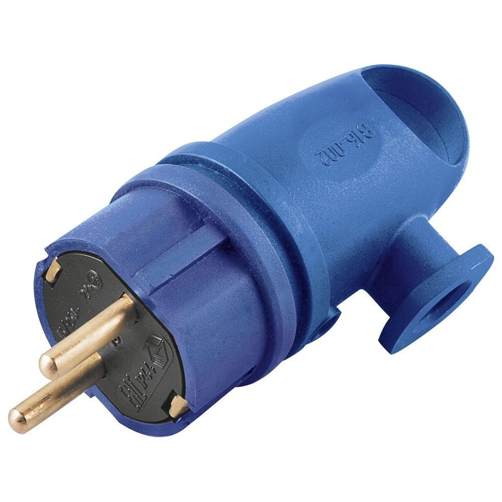 Вилка угловая с ушком STEKKER RPG16-21-442, с заземлением. Для проводов сечением 1мм2. Материал изделия каучук; цвет синий; размер 102*40*50мм. Номинальное напряжение 250В, Номинальный ток 16А, диапазон рабочих температур 0..+40°C, степень пылевлагозащиты IP44