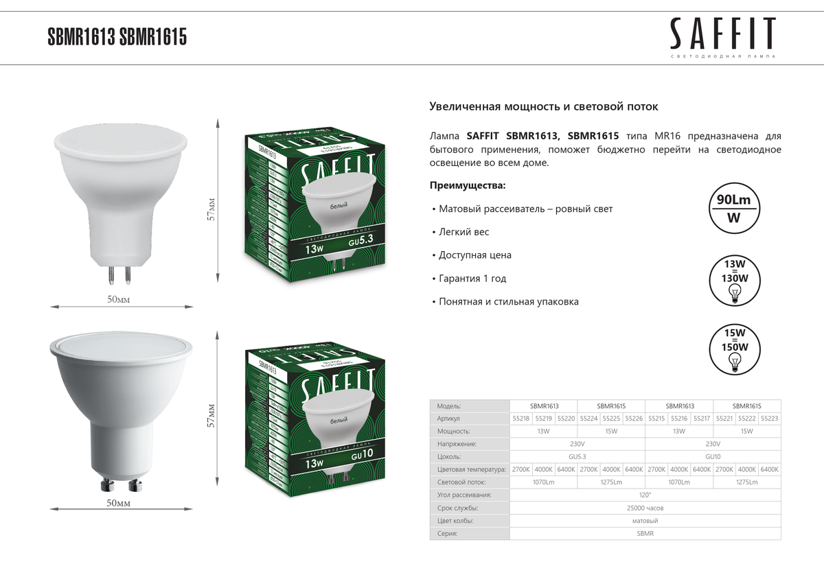 Лампа светодиодная SAFFIT SBMR1615 MR16 GU10 15W 2700K предлагает эффективное освещение с яркостью 1275 Лм и теплым белым светом. С углом рассеивания 120° и матовым рассеивателем, она идеально подходит для создания уютной атмосферы. Компактные размеры 57x50 мм позволяют легко интегрировать лампу в различные интерьеры. Подходит для использования в спотах, работает от сети 220В и обеспечивает долгий срок службы. Оптимальный выбор для эффективного и комфортного освещения.