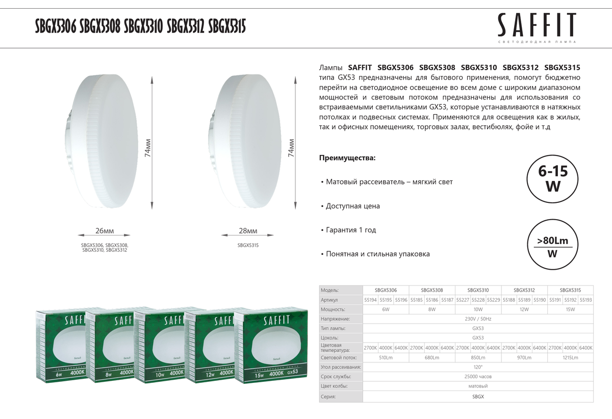 Лампа светодиодная SAFFIT SBGX5306 GX53 6W 6400K 55196 по цене 40 руб. с фотографией и техническими характеристиками. Для покупки товара нажмите кнопку "Купить" и перейдите в корзину или позвоните по телефону 8 (495) 585 32 60 или 8 (800) 222 23 53.