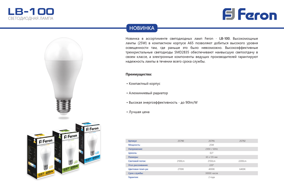 Лампа светодиодная Feron LB-100 E27 25W 4000K 230V 25791 по цене 132 руб. с фотографией и техническими характеристиками. Для покупки товара нажмите кнопку "Купить" и перейдите в корзину или позвоните по телефону 8 (495) 585 32 60 или 8 (800) 222 23 53.