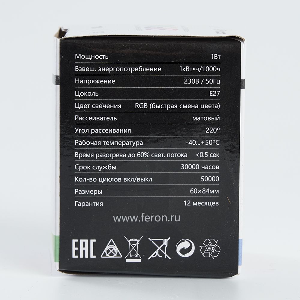 Лампа светодиодная Feron LB-37 Шарик матовый E27 1W RGB быстрая смена цвета 38126 по цене 56 руб. с фотографией и техническими характеристиками. Для покупки товара нажмите кнопку "Купить" и перейдите в корзину или позвоните по телефону 8 (495) 585 32 60 или 8 (800) 222 23 53.
