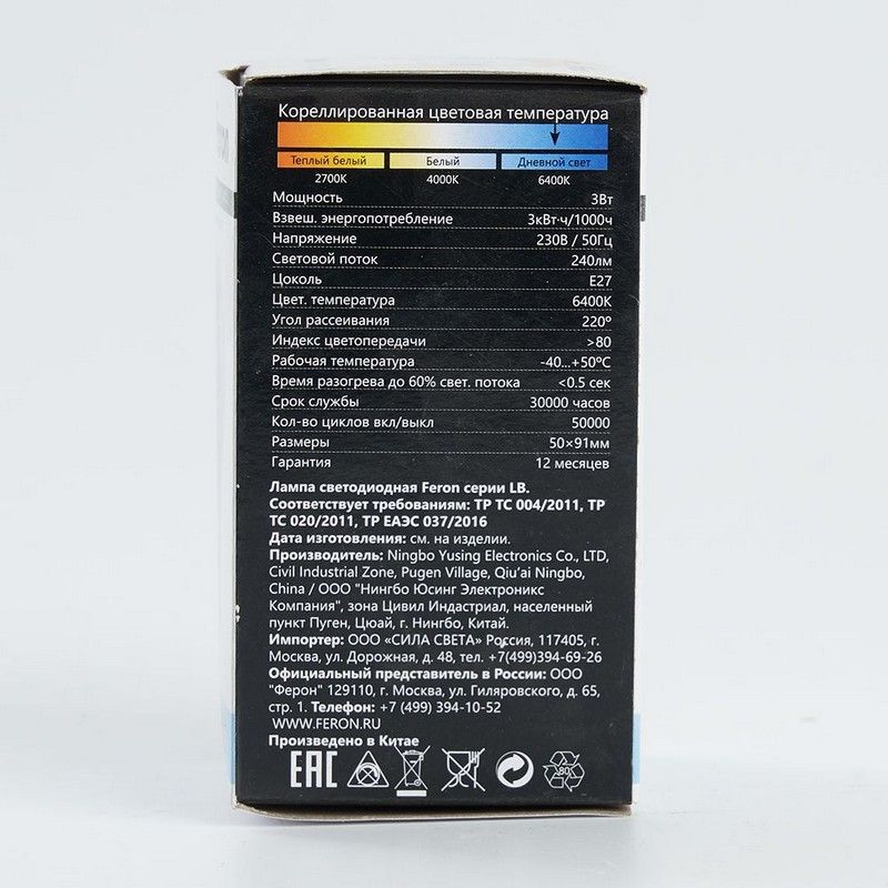 Лампа светодиодная Feron LB-375 E27 3W 6400K 25920 по цене 85 руб. с фотографией и техническими характеристиками. Для покупки товара нажмите кнопку "Купить" и перейдите в корзину или позвоните по телефону 8 (495) 585 32 60 или 8 (800) 222 23 53.