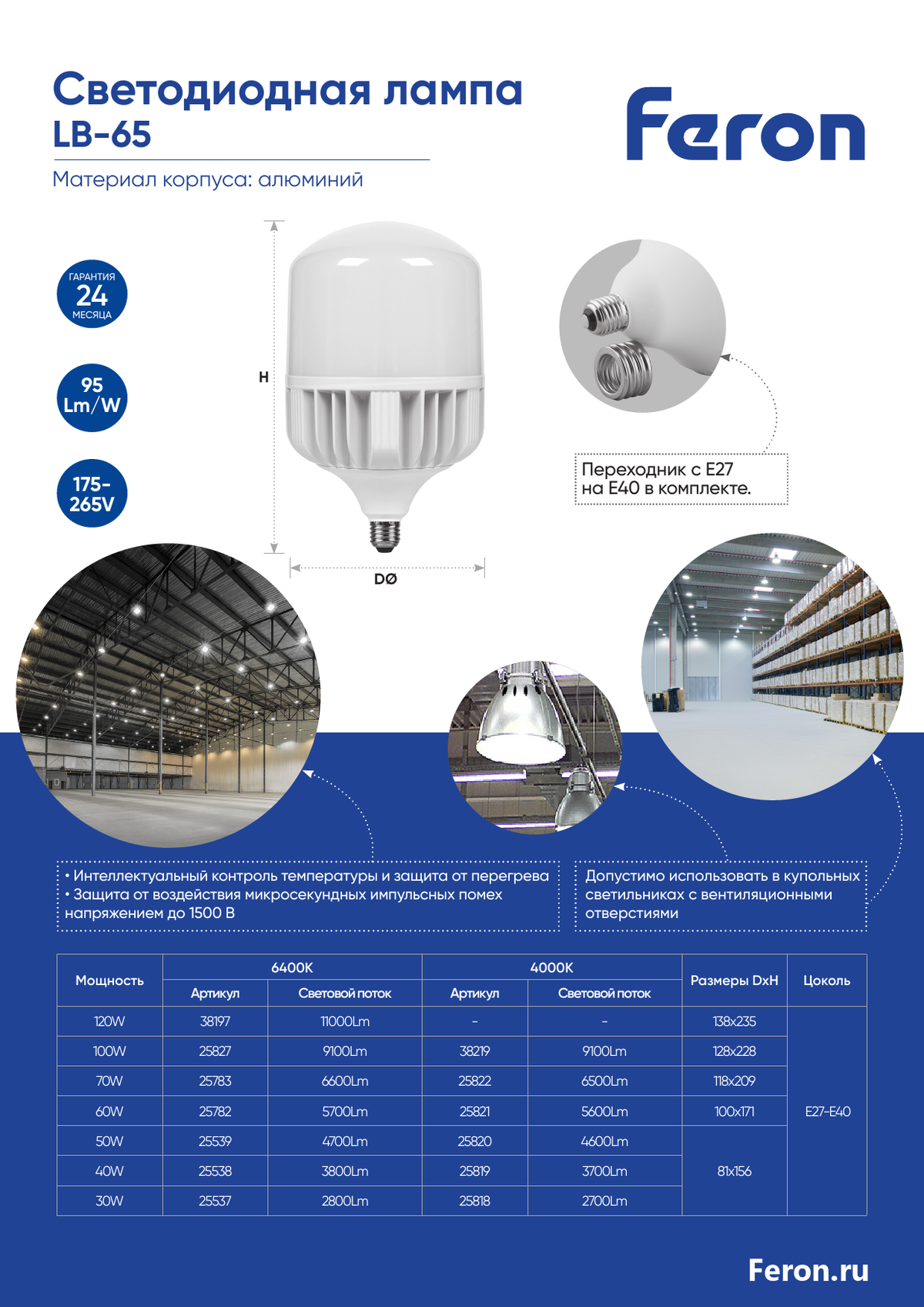 Лампа светодиодная Feron LB-65 E27-E40 70W 6400K 25783 по цене 1 140 руб. с фотографией и техническими характеристиками. Для покупки товара нажмите кнопку "Купить" и перейдите в корзину или позвоните по телефону 8 (495) 585 32 60 или 8 (800) 222 23 53.