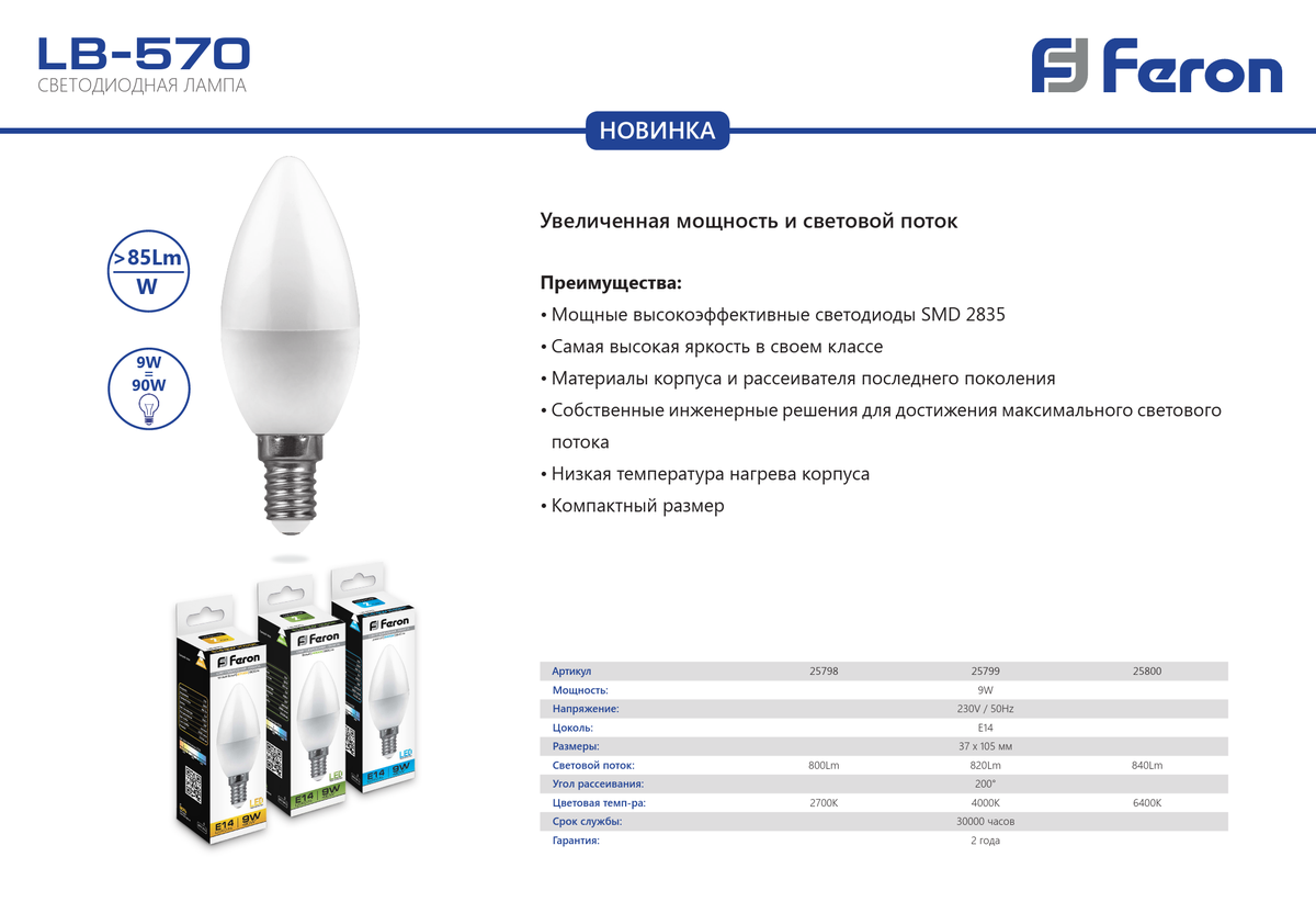 Лампа светодиодная Feron LB-570 Свеча E14 9W 2700K 230V 25798 по цене 71 руб. с фотографией и техническими характеристиками. Для покупки товара нажмите кнопку "Купить" и перейдите в корзину или позвоните по телефону 8 (495) 585 32 60 или 8 (800) 222 23 53.