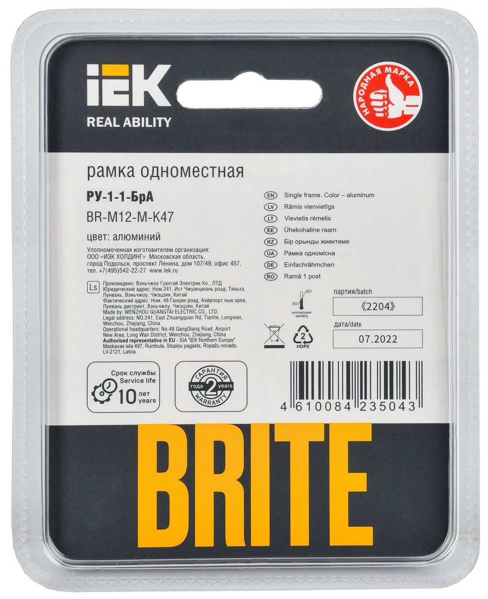 Рамка IEK BRITE 1-местная РУ-1-1-БрА металл алюминий BR-M12-M-K47 по цене 590 руб. с фотографией и техническими характеристиками. Для покупки товара нажмите кнопку "Купить" и перейдите в корзину или позвоните по телефону 8 (495) 585 32 60 или 8 (800) 222 23 53.