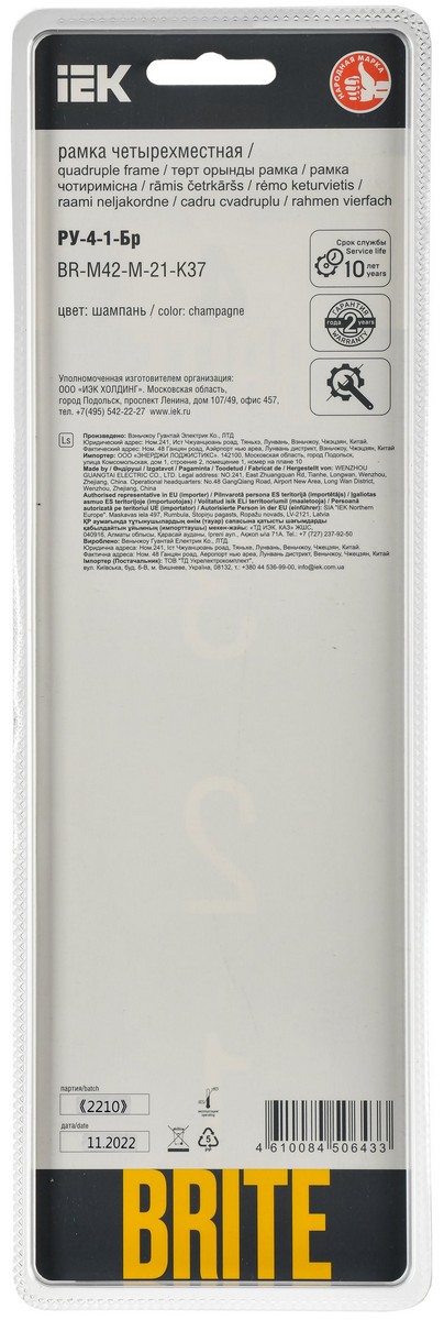 Рамка IEK BRITE DECOR Шампань металл. скругл.угол 4-м РУ-4-1-Бр RE AL BR-M42-M-21-K37 по цене 3 137 руб. с фотографией и техническими характеристиками. Для покупки товара нажмите кнопку "Купить" и перейдите в корзину или позвоните по телефону 8 (495) 585 32 60 или 8 (800) 222 23 53.