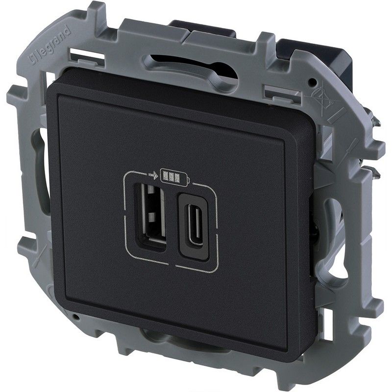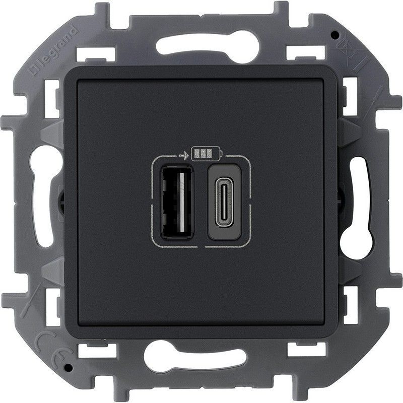 Зарядное устройство Legrand Inspiria для скрытого монтажа , тип А-тип С, цвет "Антрацит". Напряжение ~240В/=5В, максимальный зарядный ток 3000 мА.