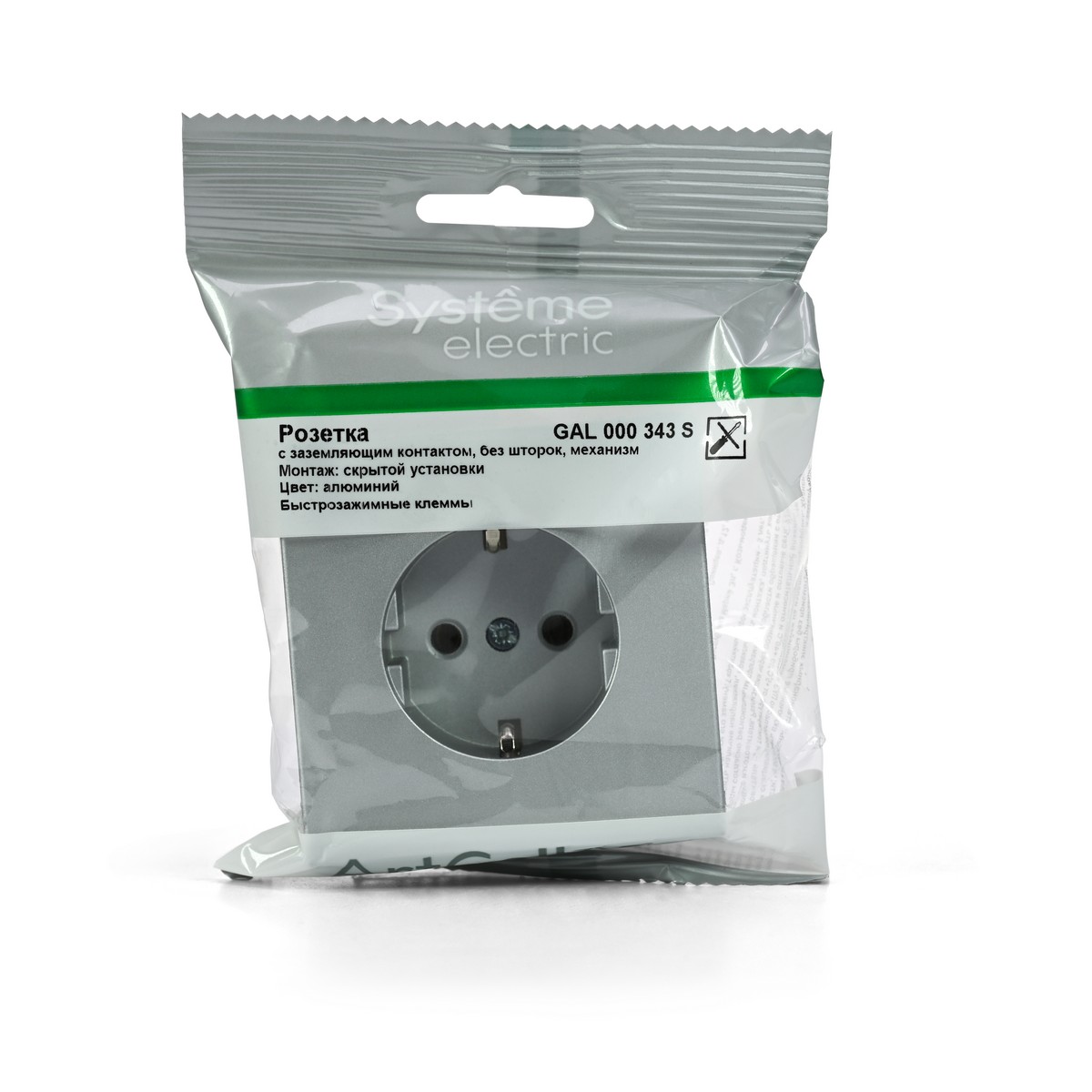 Механизм с быстрозажимными клеммами Systeme Electric серии ArtGallery в цвете алюминий розетки одинарной с заземлением и без шторок подходит для сетей 250 В, на ток 16 А.