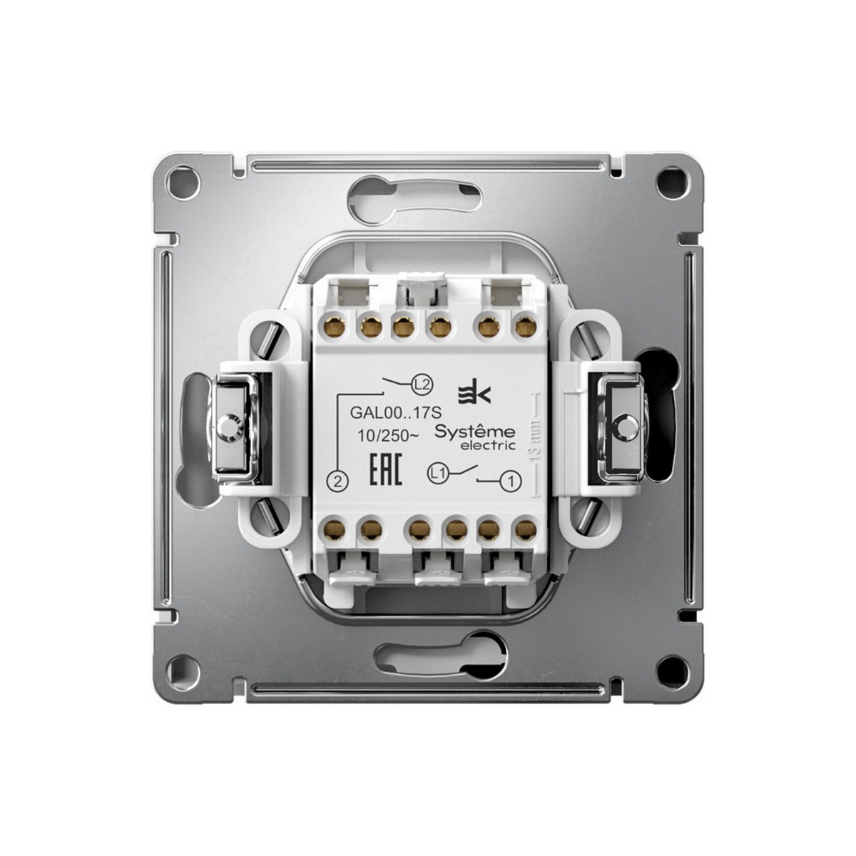 Механизм с быстрозажимными клеммами Systeme Electric серии ArtGallery в цвете белый выключателя 2-клавишного с самовозвратом подходит для сетей 250 В, на ток 10 А. С помощью новых быстрозажимных клемм монтаж стал быстрее. Для подключения не требуется отвертка. Пластик с ионами серебра в белом цвете обеспечивает антибактериальный эффект. Лицевые детали из качественного ABS-пластика, устойчивого к царапинам и УФ-излучению. Лучший промышленный дизайн (по итогам премии МИНПРОМТОРГ 2023).