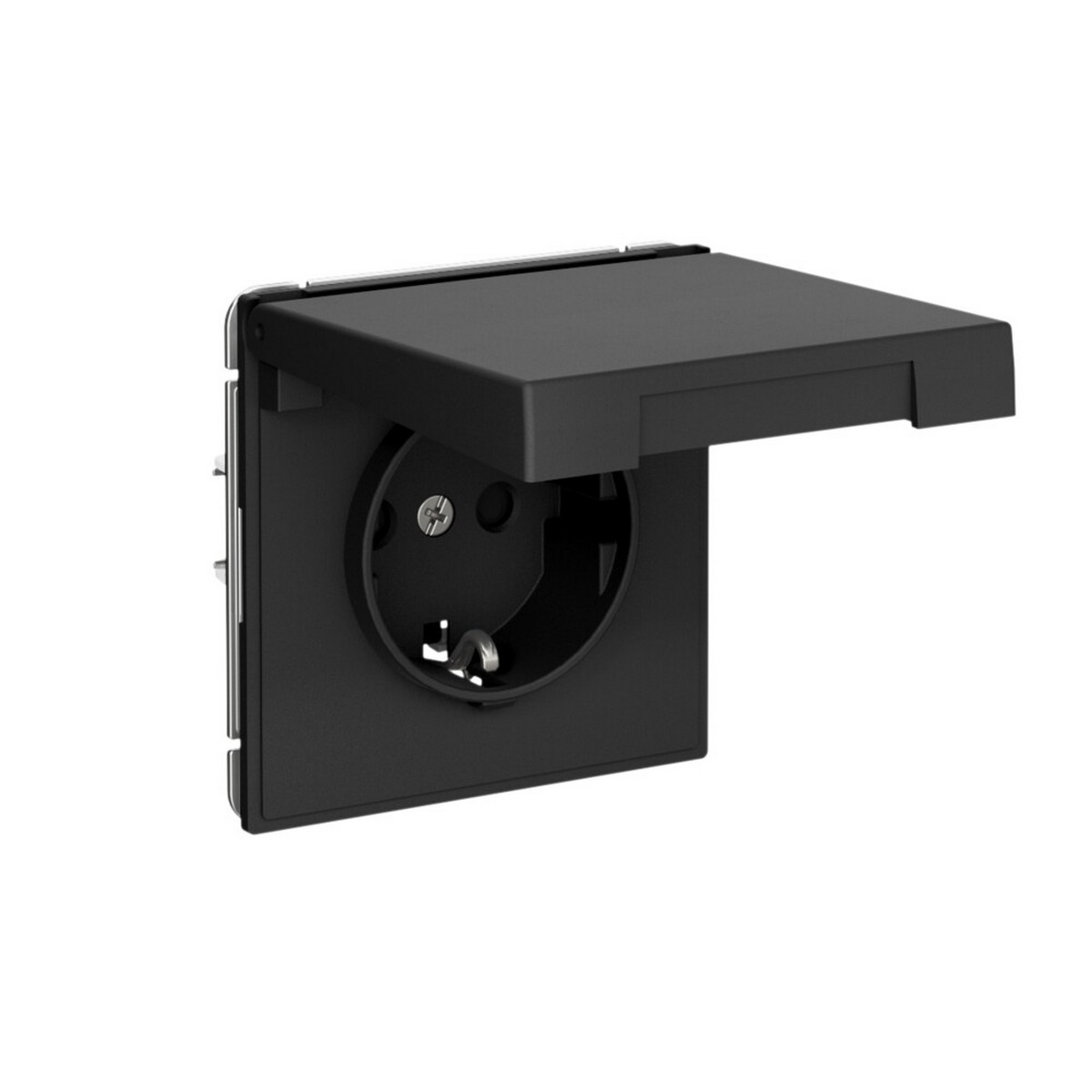 Механизм Systeme Electric серии ArtGallery в цвете карбон розетки одинарной с заземлением, шторками и крышкой подходит для сетей 250 В, на ток 16 А.
