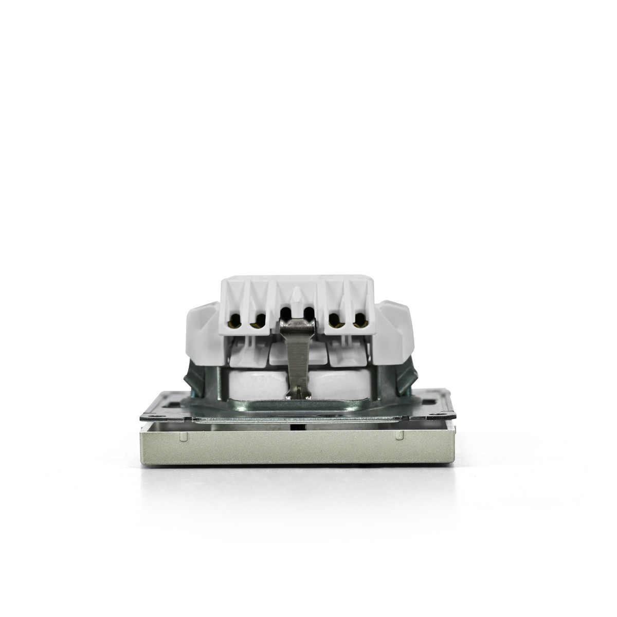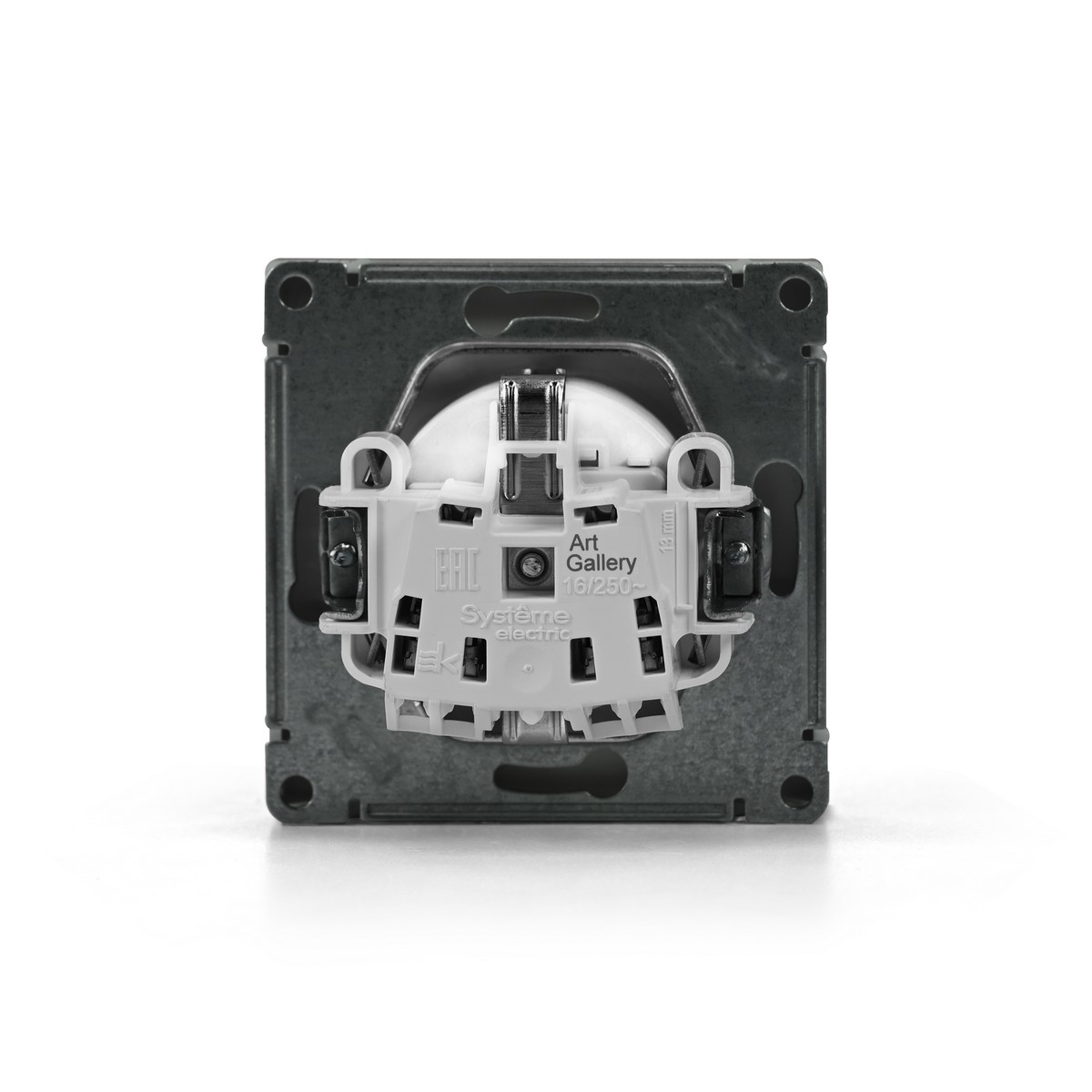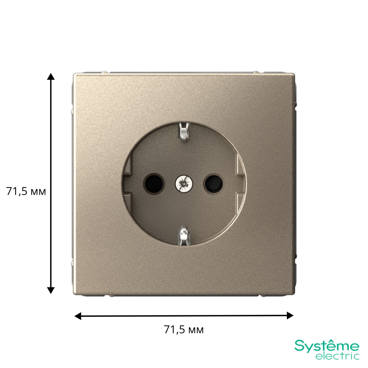 Механизм с быстрозажимными клеммами Systeme Electric серии ArtGallery в цвете шампань розетки одинарной с заземлением и шторками подходит для сетей 250 В, на ток 16 А.