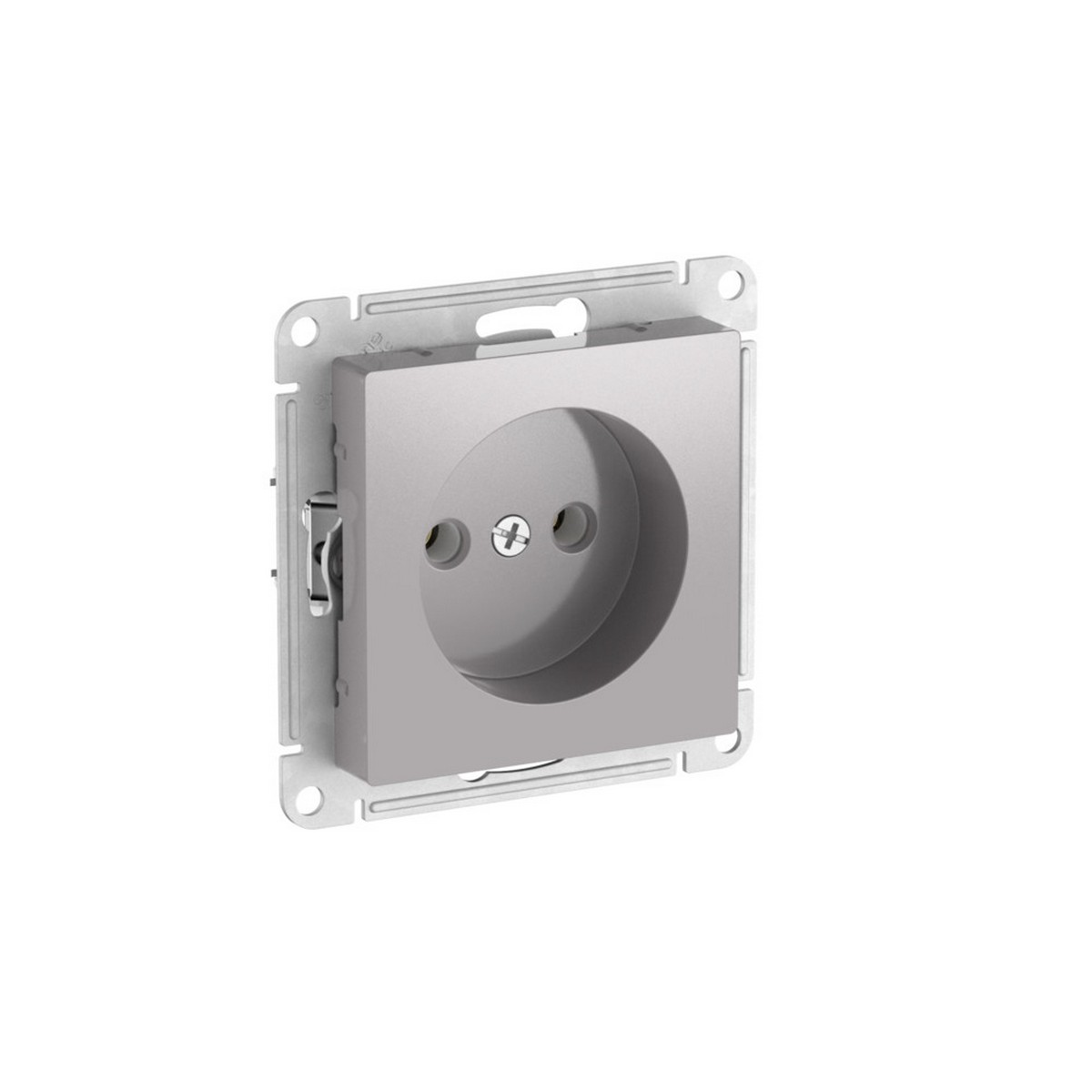 Механизм с быстрозажимными клеммами Systeme Electric (ранее Schneider Electric) серии AtlasDesign в цвете алюминий розетки одинарной без заземления и без шторок подходит для сетей 250 В, на ток 16 А. С помощью новых быстрозажимных клемм монтаж розеток и выключателей стал намного быстрее. Теперь подключение не требует использования отвертки.