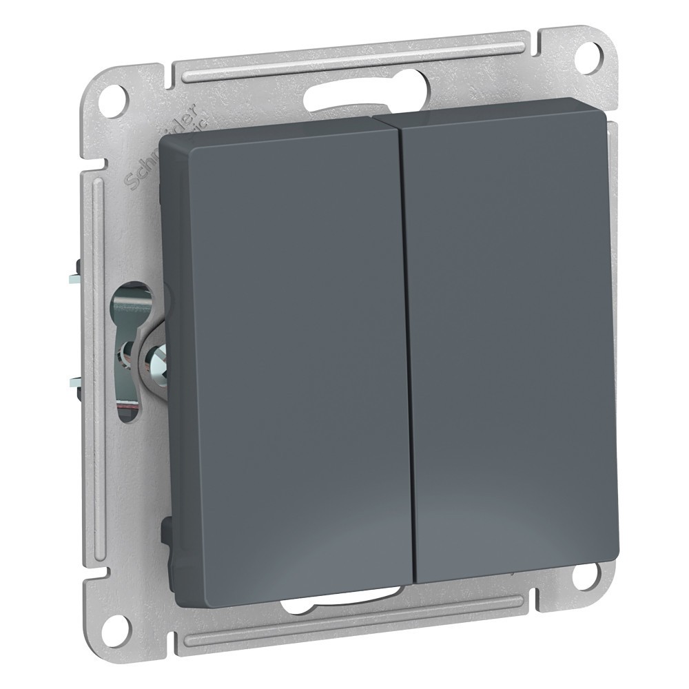Механизм с быстрозажимными клеммами Systeme Electric (ранее Schneider Electric) серии AtlasDesign в цвете грифель 2-клавишного выключателя в сборе подходит для сетей 250 В, на ток 10 А. С помощью новых быстрозажимных клемм монтаж розеток и выключателей стал намного быстрее. Теперь подключение не требует использования отвертки.