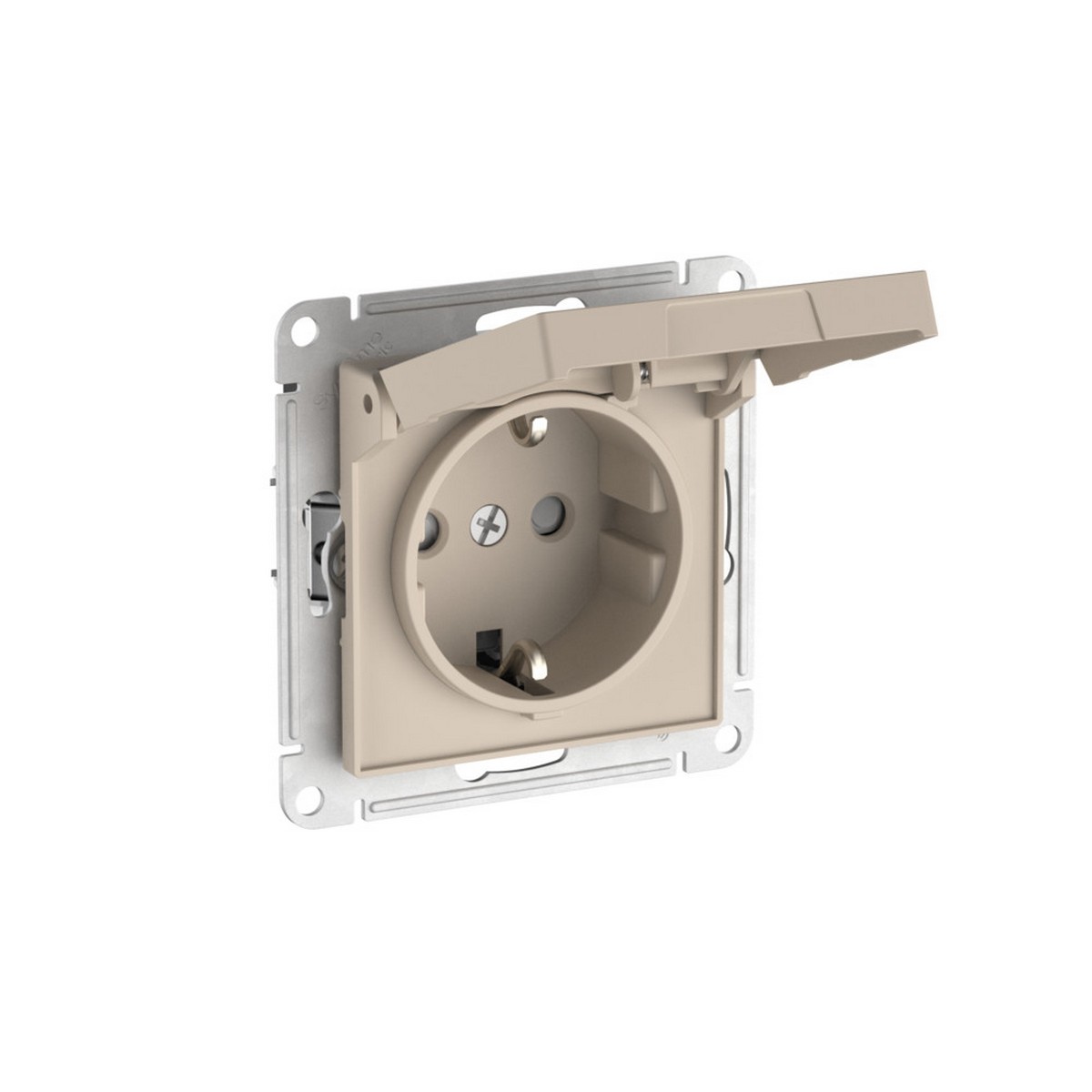 Механизм с быстрозажимными клеммами Systeme Electric (ранее Schneider Electric) серии AtlasDesign в цвете песочный розетки одинарной с заземлением, со штороками и крышкой подходит для сетей 250 В, на ток 16 А. С помощью новых быстрозажимных клемм монтаж розеток и выключателей стал намного быстрее. Теперь подключение не требует использования отвертки.