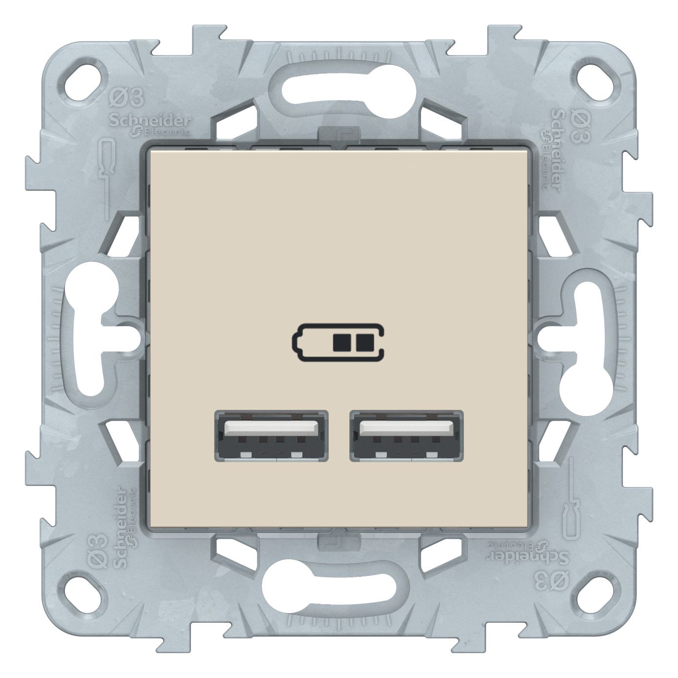 Розетка USB Unica New от Schneider Electric в бежевом цвете сочетает в себе две USB-выхода с выходным напряжением 5 В и силой тока 2100 мА. Идеальна для быстрой зарядки мобильных устройств без необходимости в адаптерах. Современный дизайн и простота установки делают её подходящей для любого интерьера.