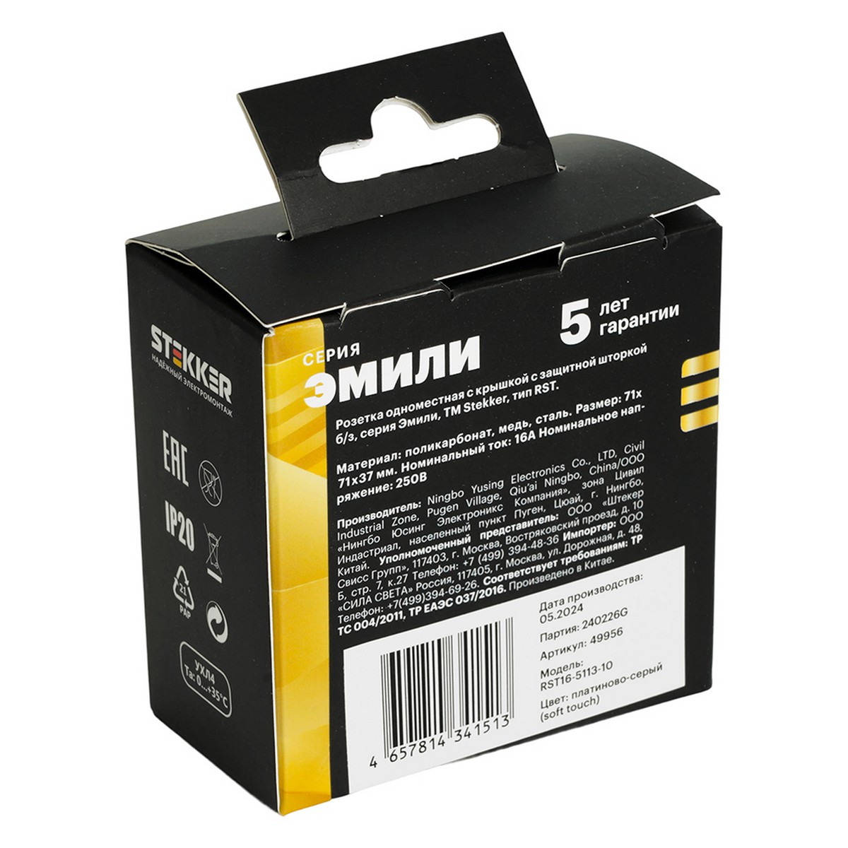 Розетка 1-ая с крышкой и защитными шторками STEKKER Эмили RST16-5113-10 предназначена для безопасного подключения электрических устройств. Артикул 49956, цвет платиново-серый soft touch. Удобная установка, современный дизайн и защита от случайного контакта делают её идеальным выбором для дома и офиса.