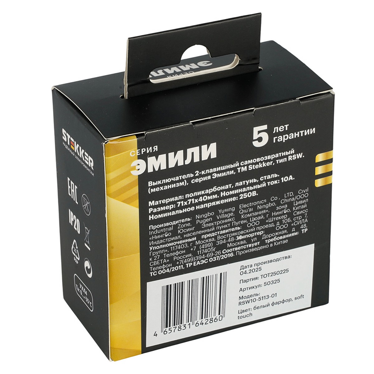 Выключатели двухклавишный STEKKER RSW10-5113-01, серия Эмили тип установки - скрытый, размер изделия 71*71*40мм., цвет белый фарфор, soft touch, материал изделия поликарбонат, латунь, сталь. Номинальное напряжение 250 , номинальный ток 10А, 20