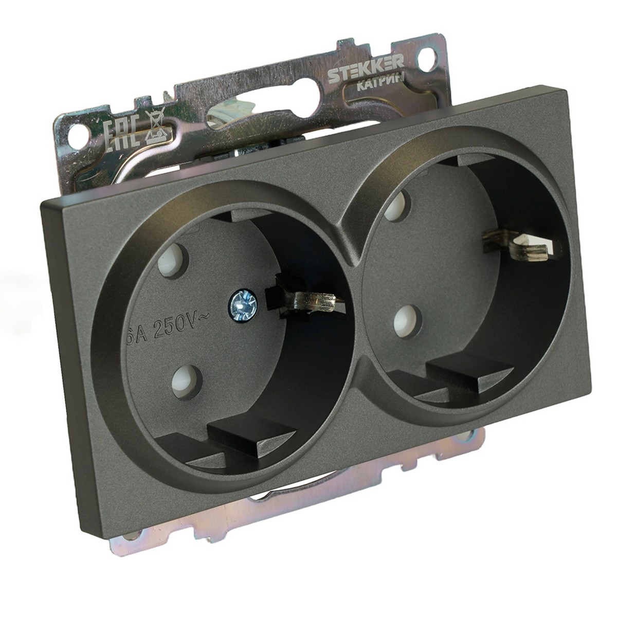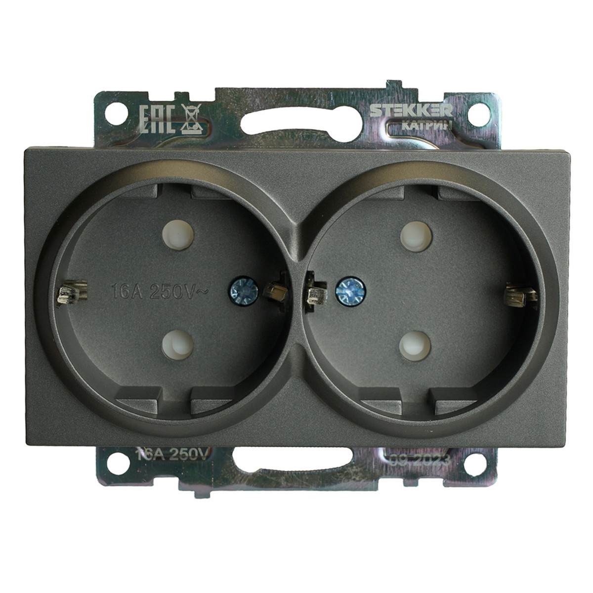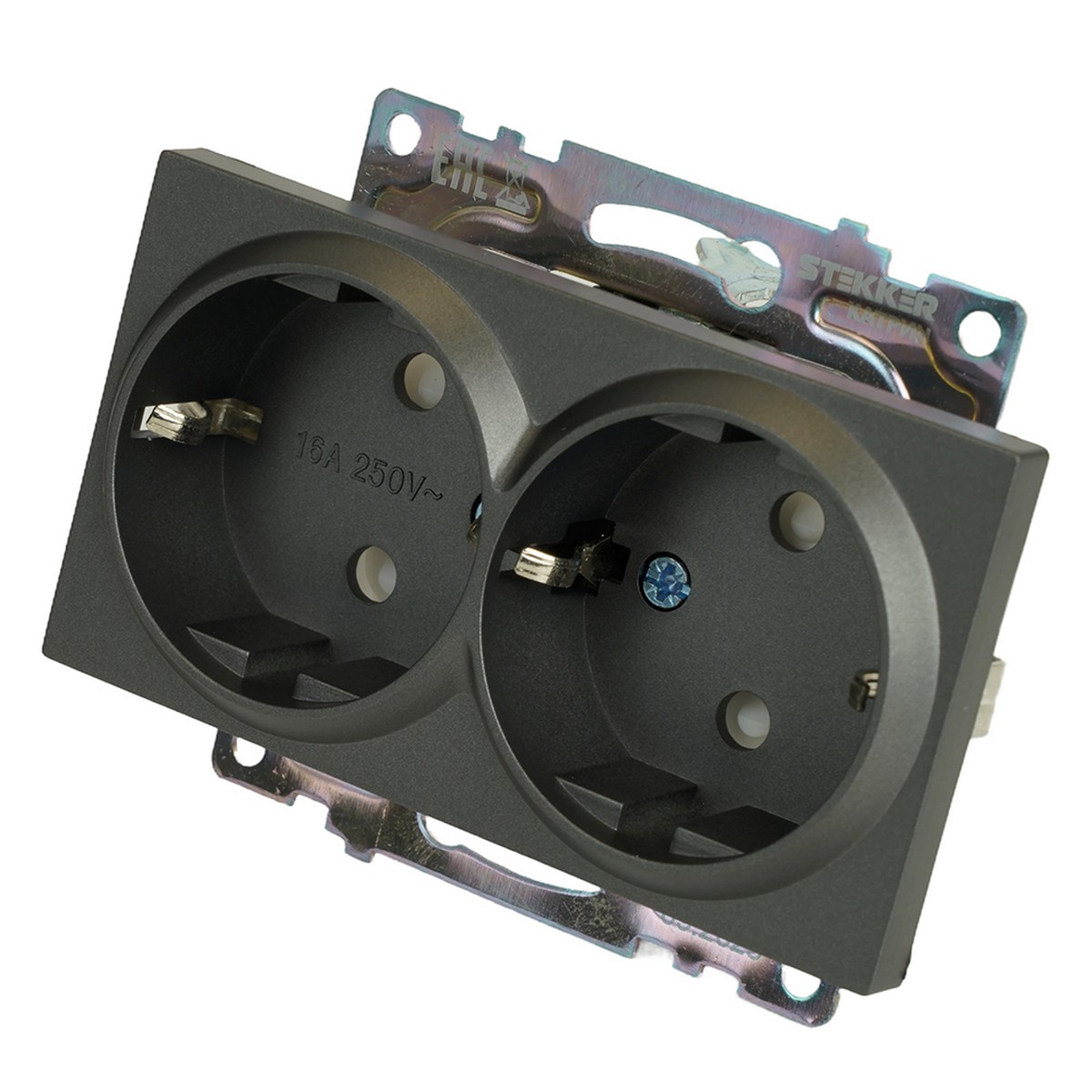 Розетка STEKKER GLS16-7114-06 на 2 гнездо, с заземлением. Материал: поликарбонат, латунь, цвет графит, размер 91*72*43мм. Номинальное напряжение 250, номинальный ток 16А, диапазон рабочих температур 0..+35°C, IP20