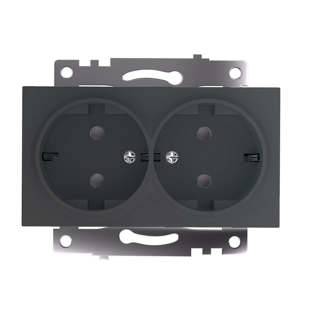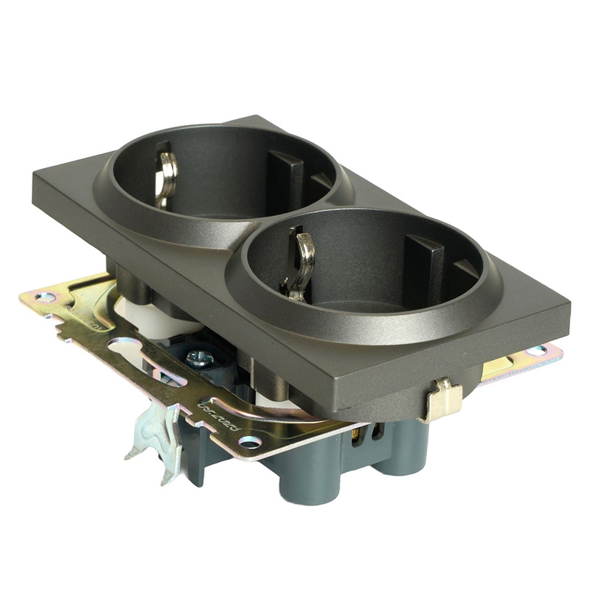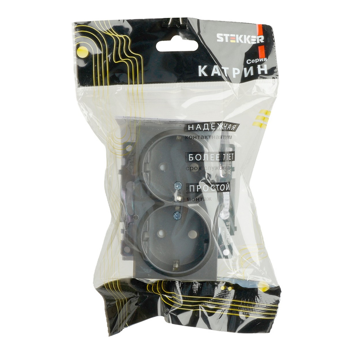 Розетка STEKKER GLS16-7114-06 на 2 гнездо, с заземлением. Материал: поликарбонат, латунь, цвет графит, размер 91*72*43мм. Номинальное напряжение 250, номинальный ток 16А, диапазон рабочих температур 0..+35°C, IP20